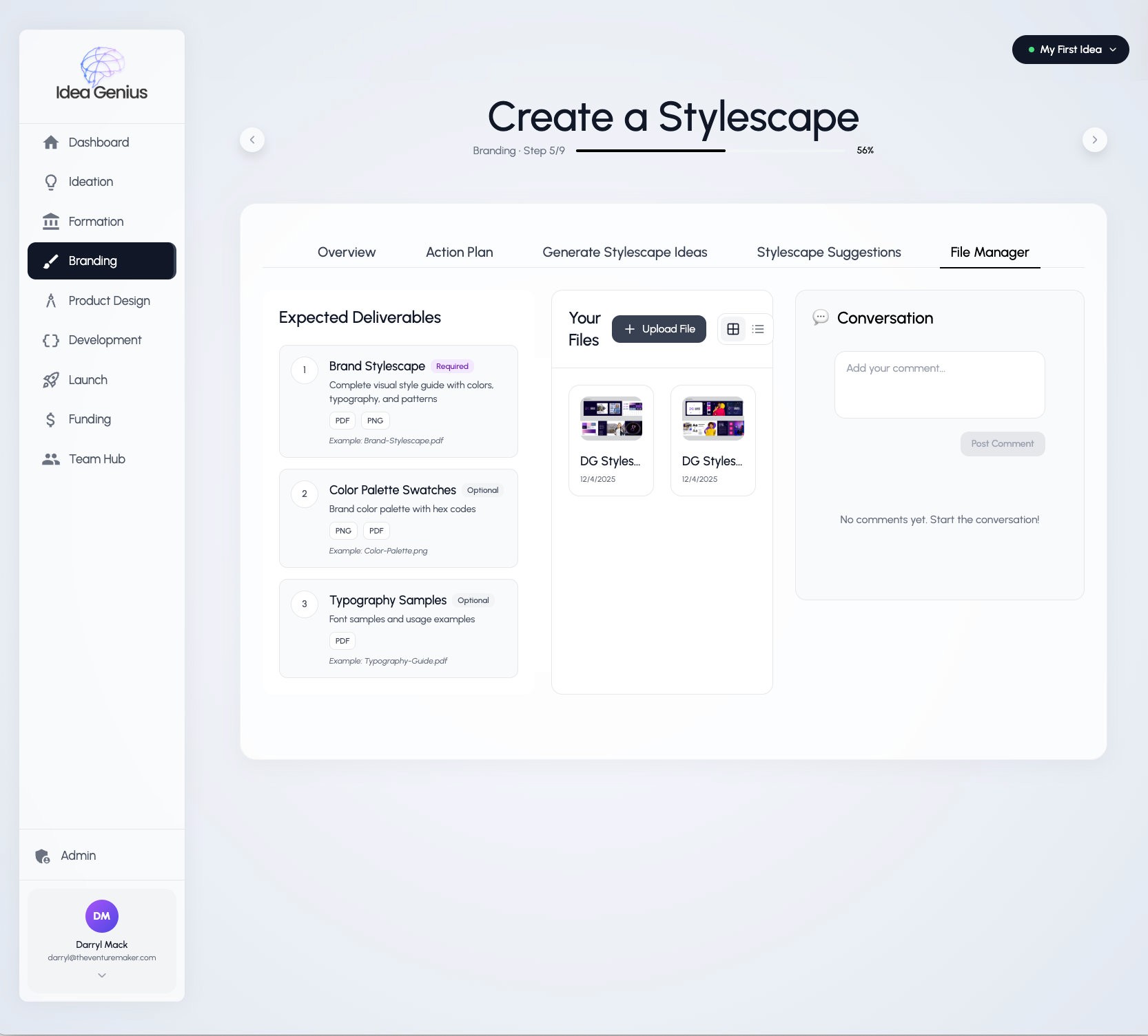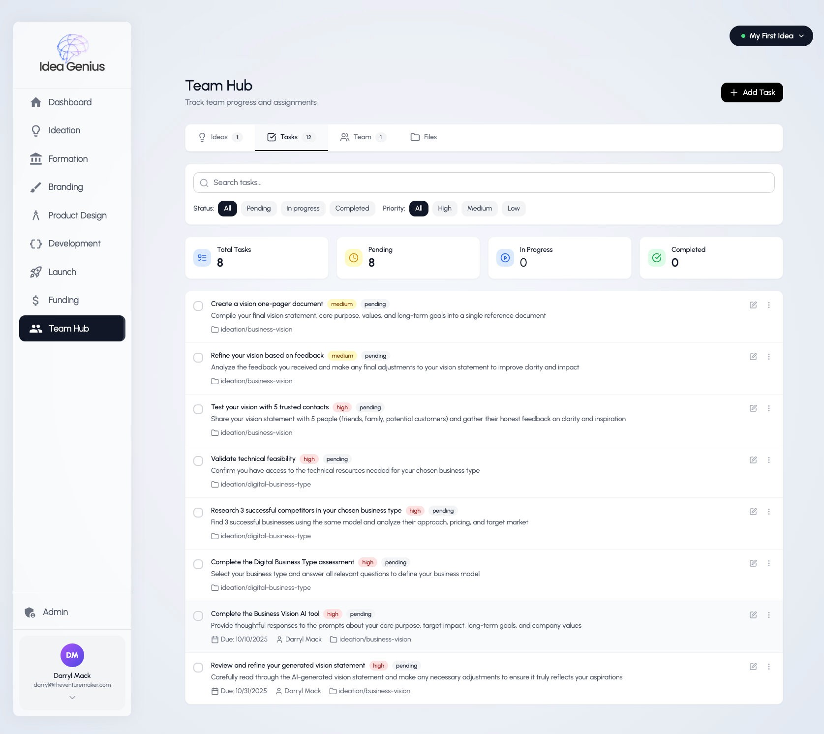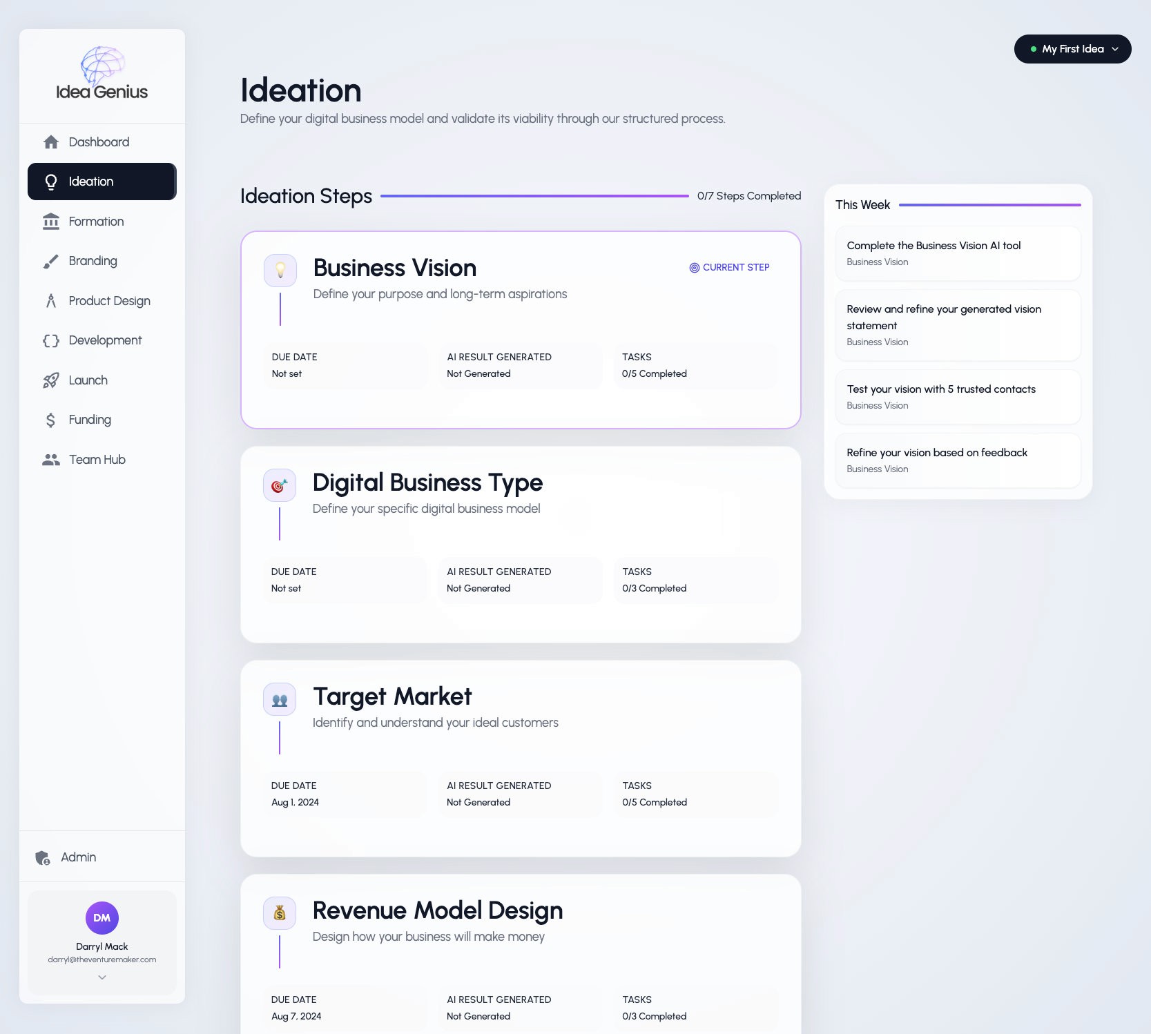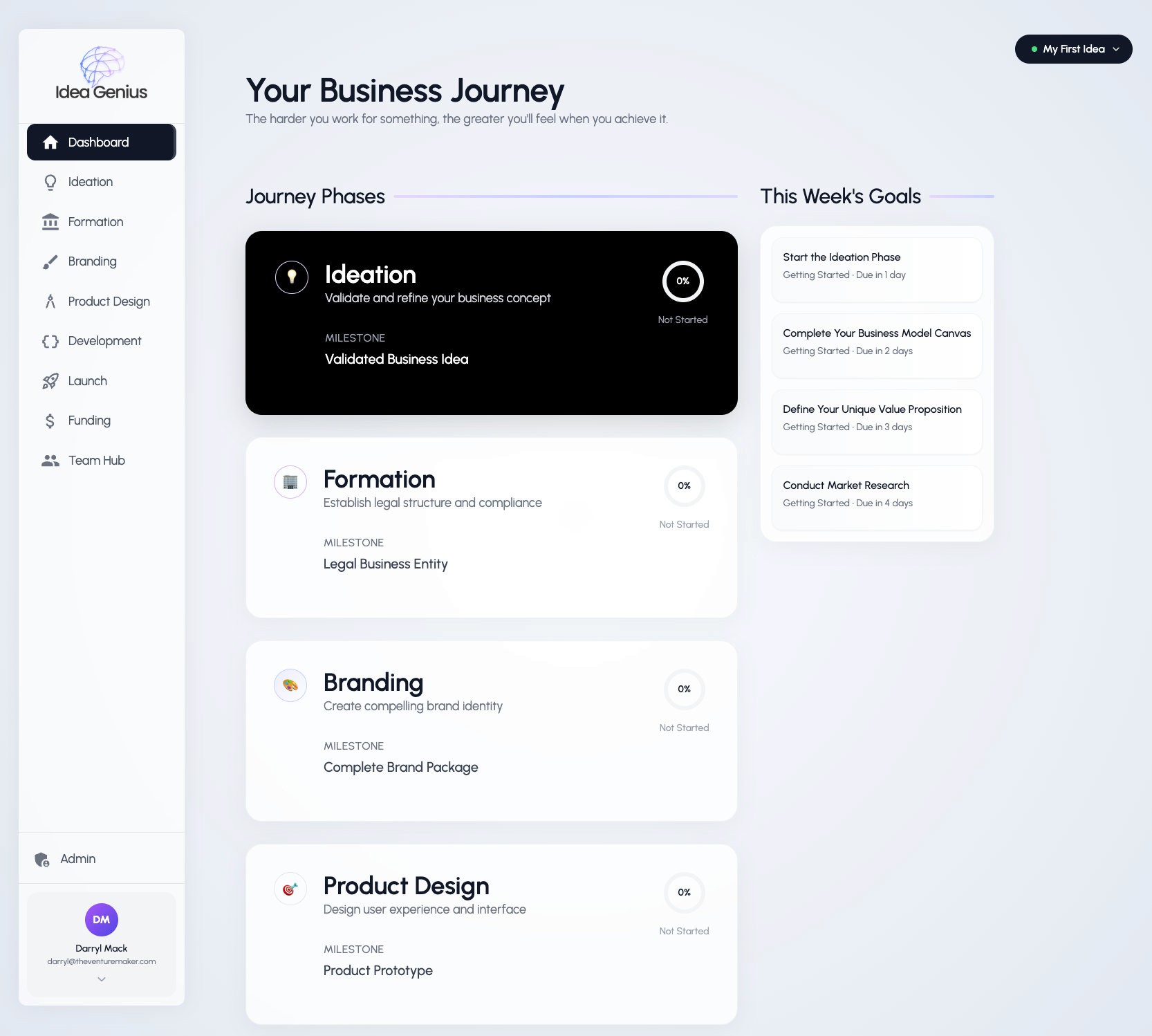 Idea Genius is an AI-powered platform that guides entrepreneurs through the entire startup journey, from ideation to funding. As founder and lead developer, I created a comprehensive system that transforms the complex process of building a startup into a structured, step-by-step experience powered by artificial intelligence.